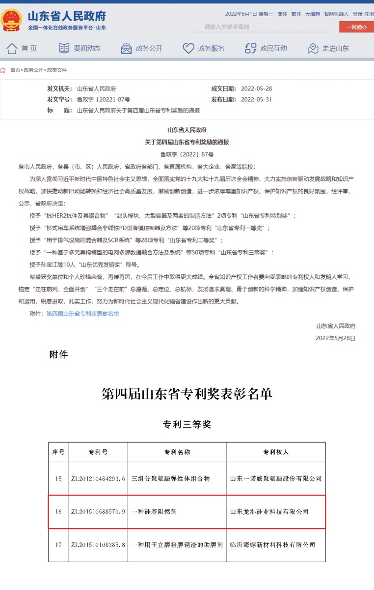 日前,山東省人民政府公布了第四屆山東省專利獎(jiǎng)獲獎(jiǎng)名單,山東龍港硅業(yè)科技有限公司的發(fā)明專利“一種硅基阻燃劑”被授予山東省專利獎(jiǎng)三等獎(jiǎng)?!?/p>